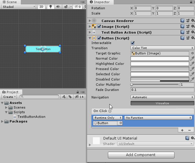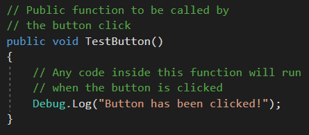 For this example, we’ll call our function “TestButton”, and we’ll use some very simple code to print a debug log. However, you can use any code you want in place of this, and name your function to whatever you like.