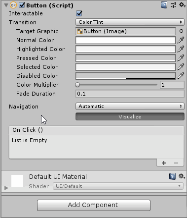 This can be attached to the Button itself, or to any other GameObject. Just remember that the GameObject will have to already exist in the scene – this won’t work with dynamically spawned GameObjects.