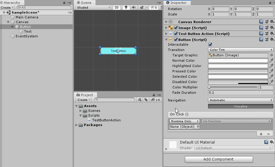 In our example, we’ll drag the Button itself into this slot, since that is where our TestButtonAction script is (created in Step 1 and attached in Step 5).