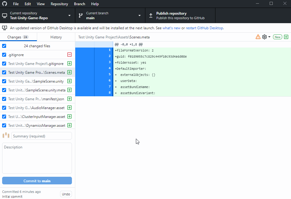 In the “Changes” section, you should see around 24 files. This will include all of your blank Unity project’s files, as well as your .gitignore file.