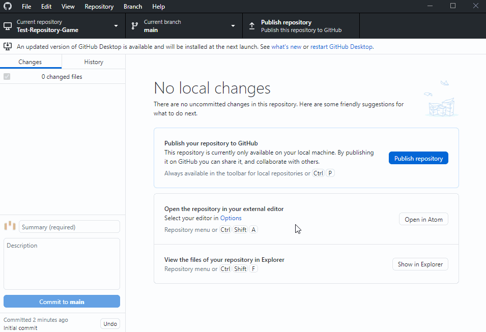 Once you get a new, blank project setup, the first thing to do is always make an initial commit just saving the setup to version control. To do this, go back to GitHub Desktop. You should see some changed files in your repository.