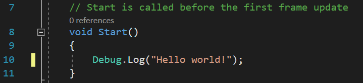 Let’s write our first code to see how these functions work. Add a new line inside the curly braces surrounding the Start() function. It is important to remember that curly braces are used to show groupings in the code – if we want our code to be part of the Start() function, it needs to be inside that function’s curly braces!