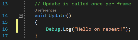 Inside the class, you will see two other bits of code – one with the word Start and one with the word Update, both followed by parentheses ( )